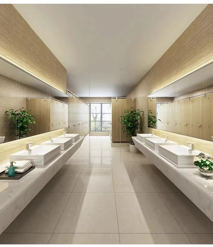Przestrzeń handlowaHotel/centrum handlowe: Struktura słojów drewna/kamienia podkreśla teksturę przestrzeni i umożliwia szybki demontaż i renowację (wskaźnik ponownego wykorzystania ≥ 90%).